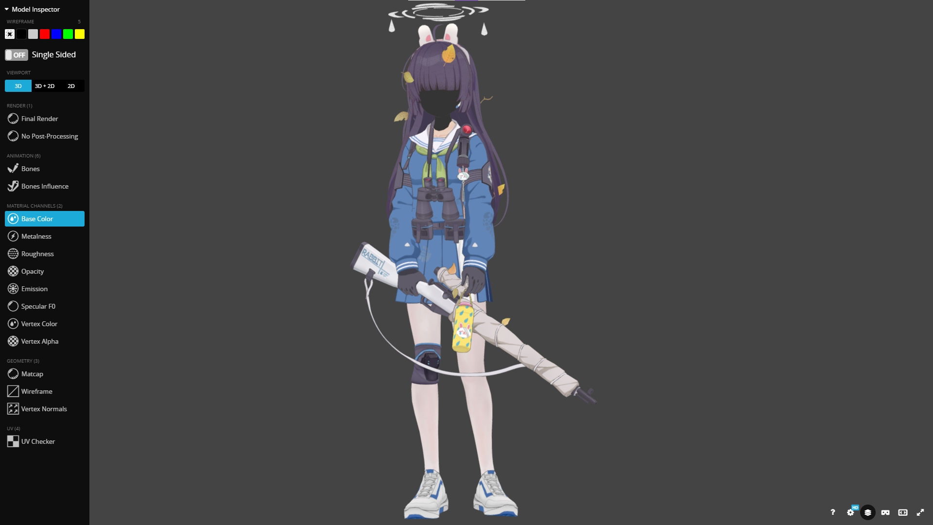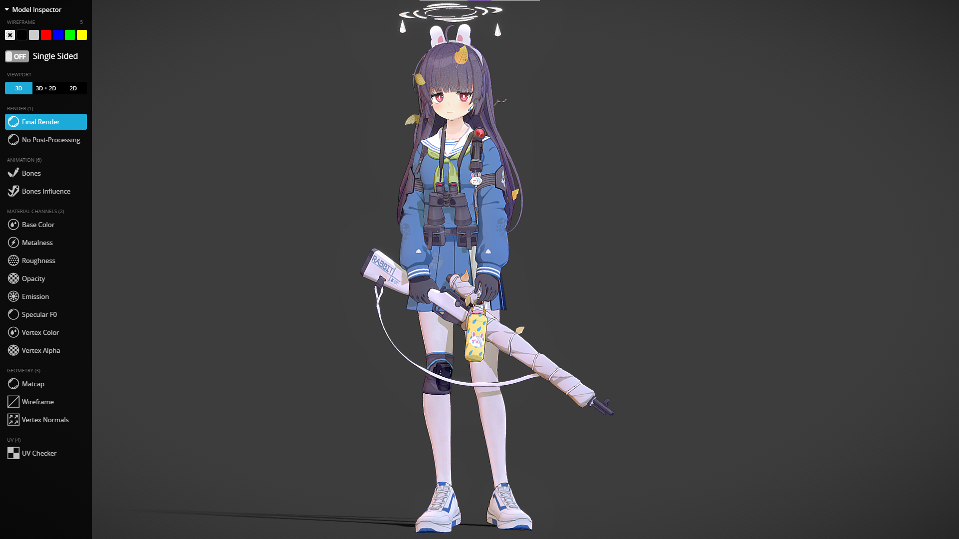 최종 렌더링 결과물이다. 물론 지금 결과물도 완벽하진 않다. 그림자 처리도 되고있지 않으며, 옆에 붙어있는 나뭇잎의 텍스쳐는 투명도 설정을 해줘야되는데 그것도 안되있고.. 하지만 서브컬쳐풍의 캐릭터 렌더링 방법에 대해 큰 깨닳음을 얻을 수 있었던 좋은 디버깅 과정이었던 것 같다.