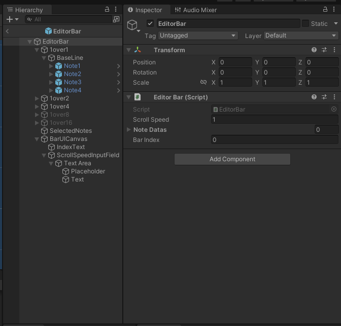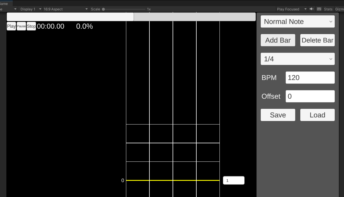문제가 발생하기 시작한건 롱노트를 추가하기 시작하면서 부터였다. 이미 시중에 나와있는 여타 리듬게임들처럼 내가 직접 패턴을 만들고싶은 마음도 강했고, 패턴 에디터를 먼저 만들기 시작했다. 에디터의 구조는 마디 단위로 이루어져 있으며, 마디마다 노트가 미리 배정되어있어 누르면 활성화되는 방식으로 구현했었다.
