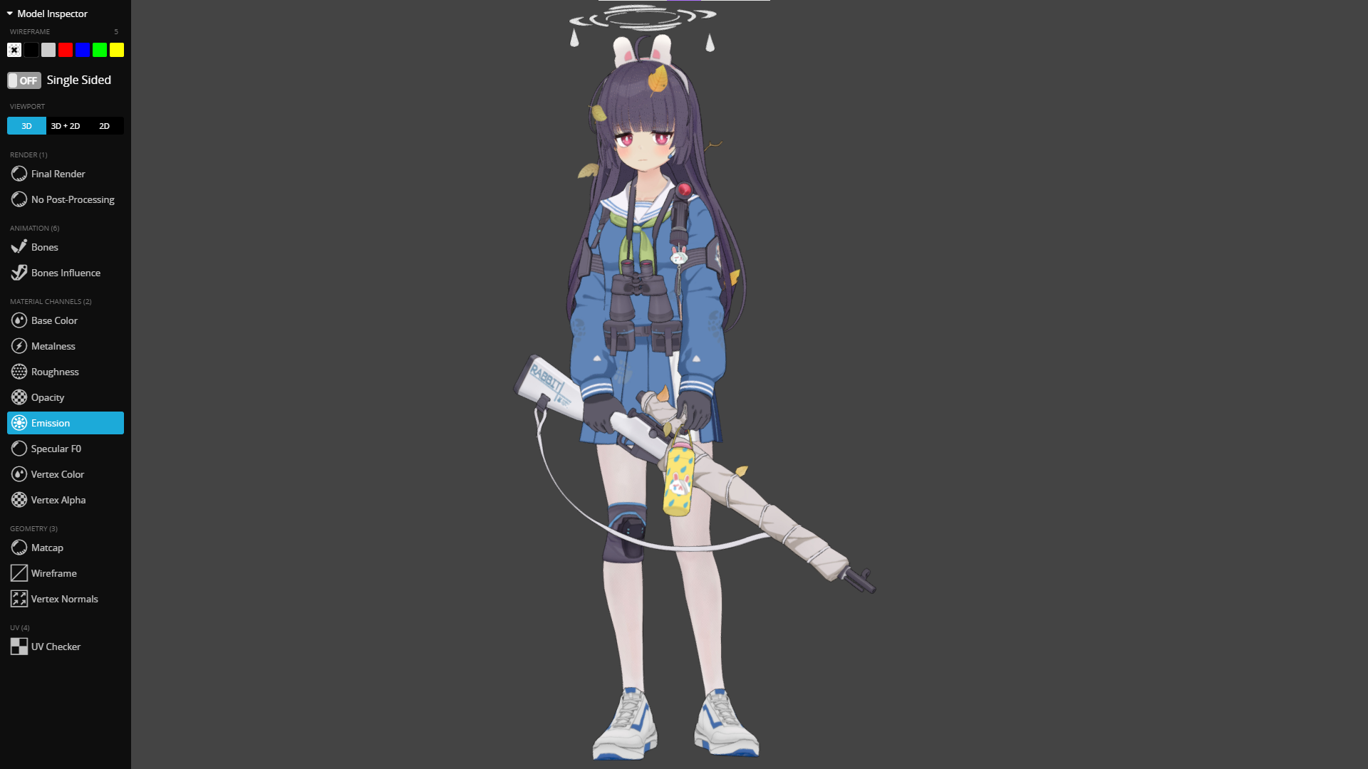 최종 렌더링 결과물이다. 물론 지금 결과물도 완벽하진 않다. 그림자 처리도 되고있지 않으며, 옆에 붙어있는 나뭇잎의 텍스쳐는 투명도 설정을 해줘야되는데 그것도 안되있고.. 하지만 서브컬쳐풍의 캐릭터 렌더링 방법에 대해 큰 깨닳음을 얻을 수 있었던 좋은 디버깅 과정이었던 것 같다.
