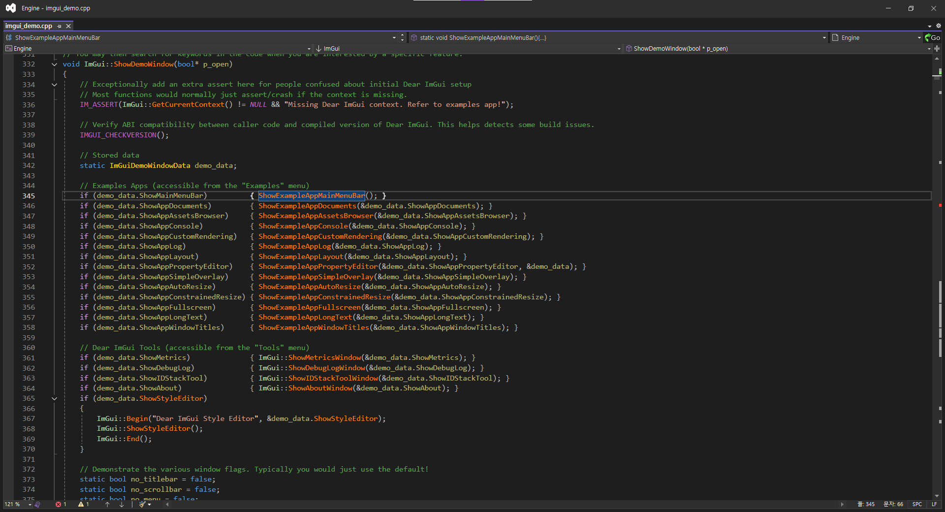 상단의 코드에서 EngineGUIManager.cpp의 Render() 메소드 내부 ImGui::ShowDemoWindow() 메소드를 타고 들어가면 모든 기능에 대한 코드를 열람할 수 있다.